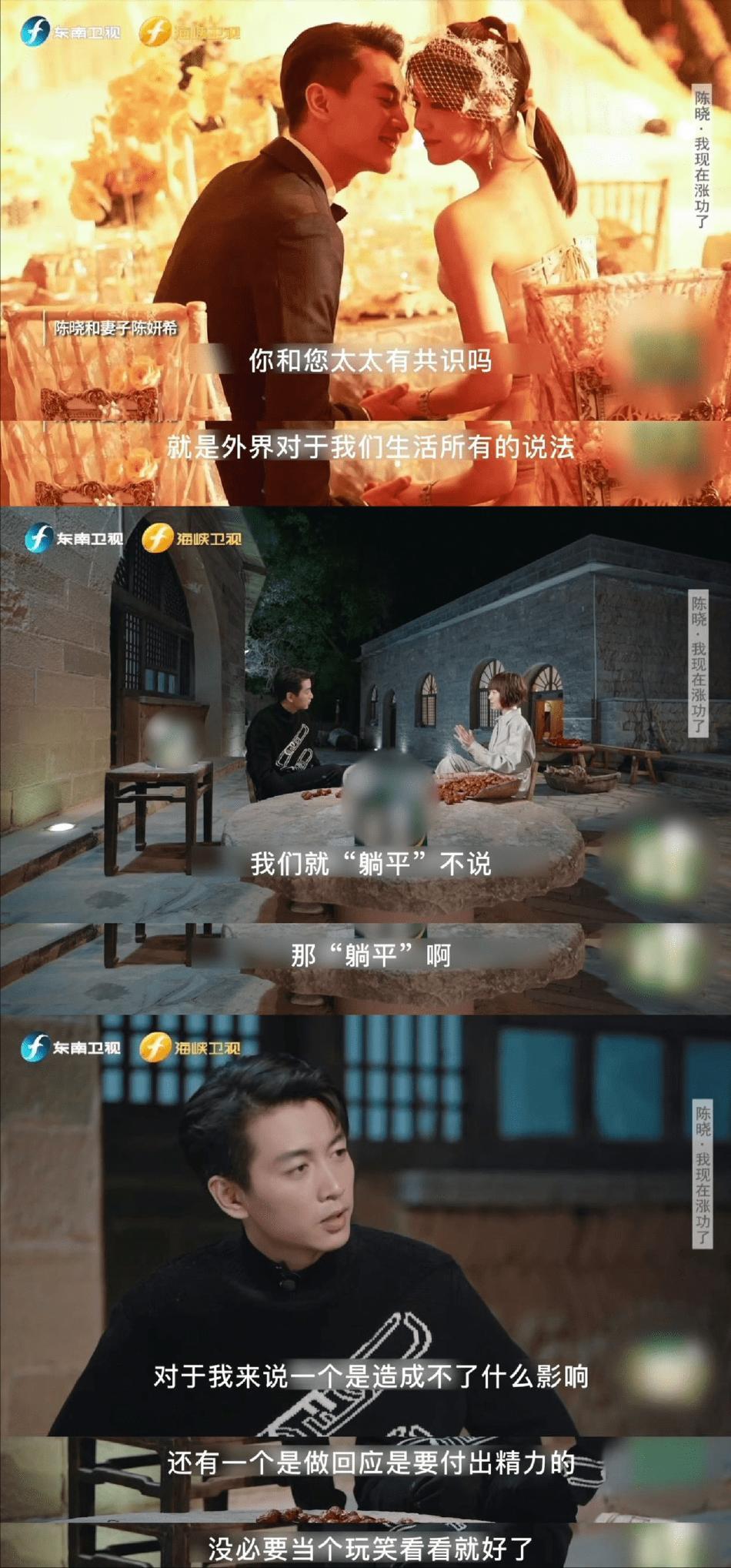 对此,陈晓曾在一档访谈节目中回应称,会将工作和生活完全分开,完全不分享,外界对于他们夫妻二人的说法或传言,不知从何解释,于是和陈妍希达成共识选择“躺平”:“对我来说造成不了什么影响,还有做回应是要付出精力的,没必要,当个玩笑看看就好了,而且可能连玩笑都算不上。”