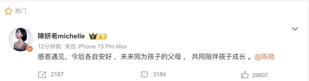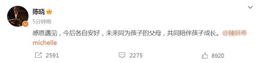 今年2月18日,@陈晓 @陈妍希michelle 共同发声:“感恩遇见,今后各自安好,未来同为孩子的父母,共同陪伴孩子成长。”